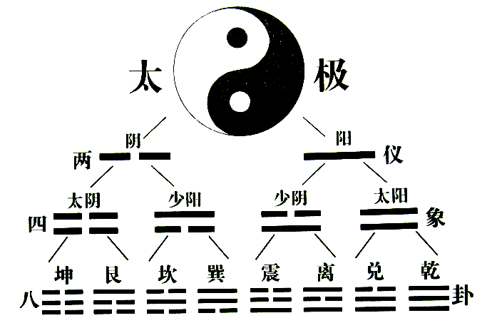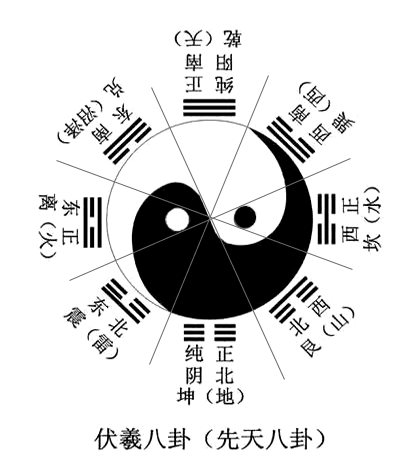 根据天地定位,在盘古初开之时,五行通天地,八卦定乾坤是古人观天象发现黑白色奇异的图案像两条鱼,因此绘成图画此乃"先天太极图"掛在墙上或放在桌面上坐北向南,从两条阴阳鱼中心平均分为八份,每个方位又分上中下三份去观察:发现阴阳鱼所占的图影比例各有不同而发明作的图,就是如上的"先天太极八卦图"。伏羲氏(或某古人)用最简单的直线作记录,用一横(—)代表白色鱼为天,称阳爻,用两条分开的横线(--)代表黒色鱼为地,称阴爻,运用这两种最简的符号按图画爻,发明了“太极生两鱼,两鱼生四象,四象生八卦”的一分为二进制定律。